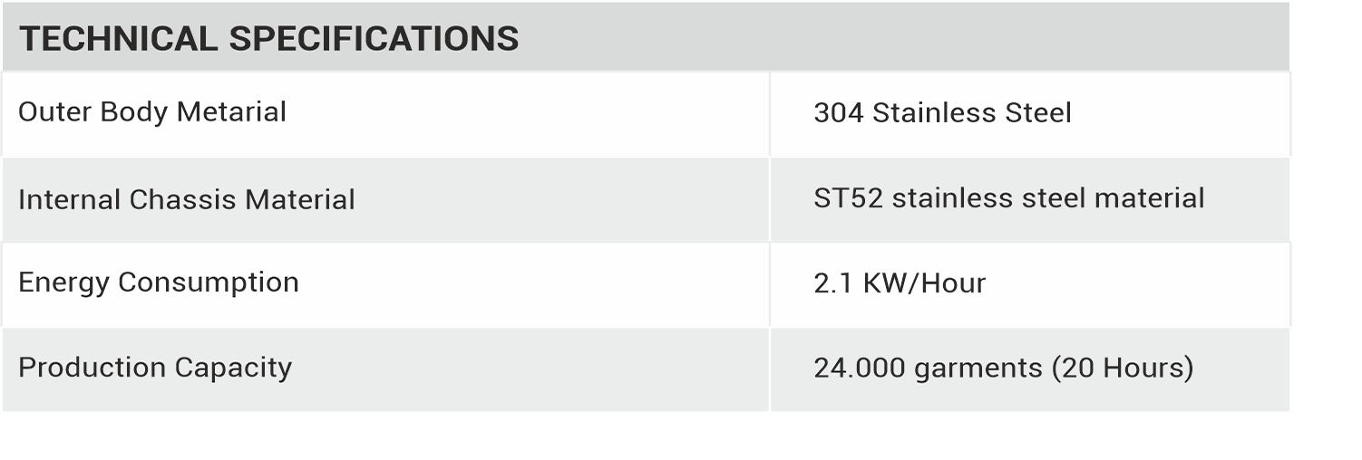 For the first time in our country we have developed adenim extracting system which gives manufactures an excellent advantage in the laundry process. First of all RM-TORK denim extracing system removes any possible job related accidents caused by old fashion centrifuge extracting machines. With its excellent energy effıciency and the advantage of only having to work with I employee per shift. In 20 hours RM-TORK is capable of extracting 24.000 garments.